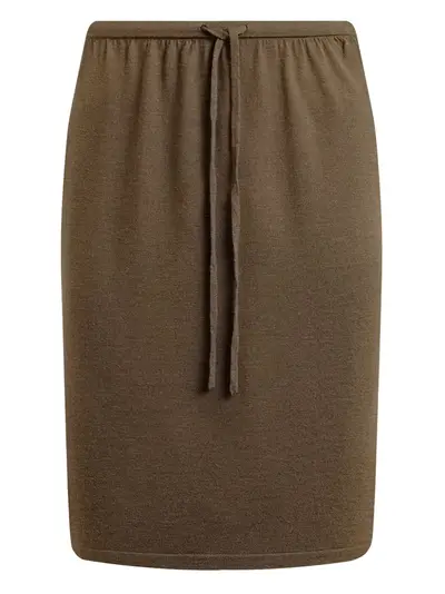 brown elasticated drawstring waistband above-knee length pencil silhouette fine-knit construction straight hem merino wool