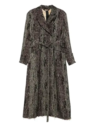 black abstract pattern print notched lapels belted waist double-breasted button fastening