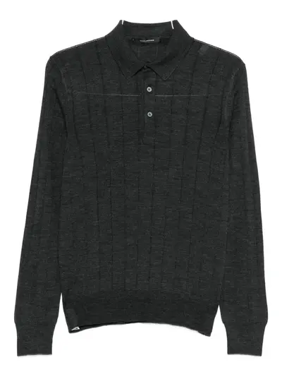 grey ribbed knit button fastening polo collar long sleeves straight hem