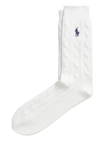 crisp white cable knit design ribbed cuff embroidered logo reinforced heel soft finish Be sure before opening, as socks and hosiery can only be returned in their original, unopened packaging.