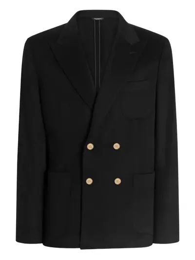 black double-breasted peak lapels front flap pockets chest welt pocket button fastening