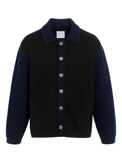 dark blue and black wool cashmere blend contrasting panels button front fastening ribbed collar long sleeves