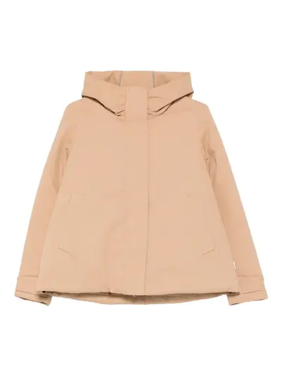 beige classic hood front button fastening side flap pockets long sleeves straight hem