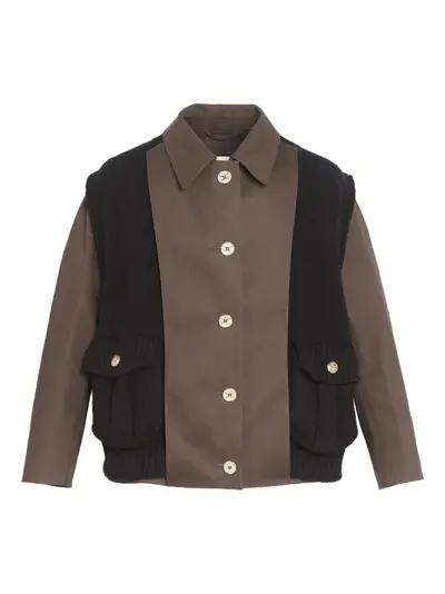 brown button fastening layered knitted panel patch pockets gold-tone buttons cotton