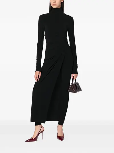 black high neck long sleeves open back draped detail front slit