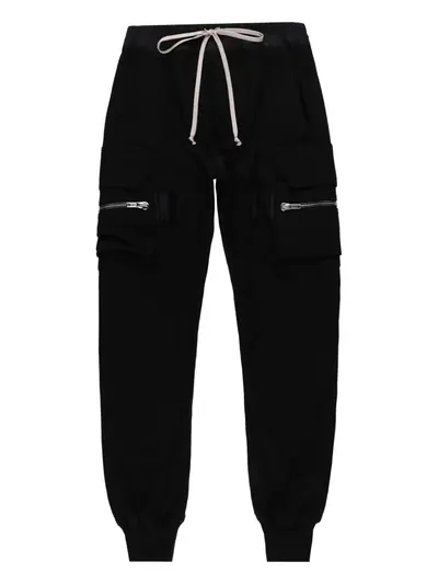 black drawstring fastening elasticated waistband side zip pockets rear flap pockets elasticated cuffs