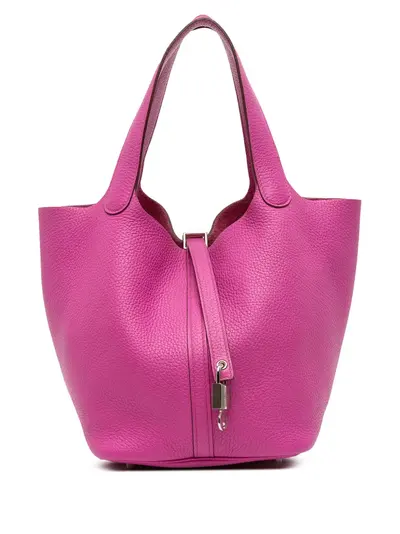 Clemence leather body in Magnolia color flat leather handles open top with a pull through strap and lock closure pink Inclusions: padlock, key. Condition: EXCELLENT. This previously owned item is in near-perfect condition with no signs of damage or use. Declared Damages: Handle/Strap Feature(s) Minor Loose Stitching. Please refer to the photos on this product page for a detailed view of the item, including any damages declared.