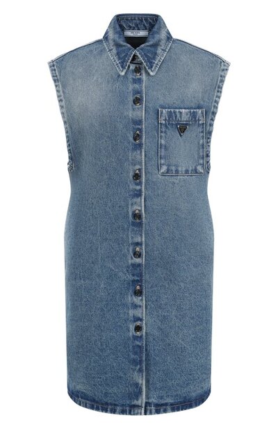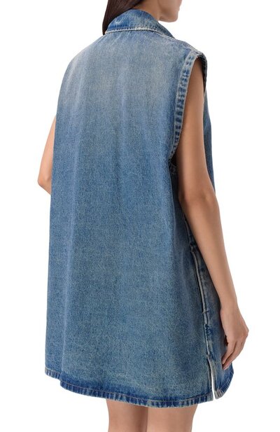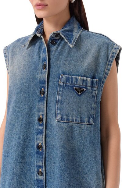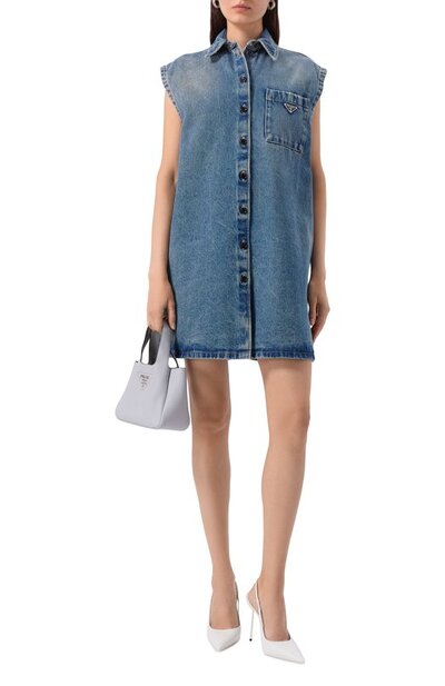 Выбеленному платью-рубашке с отложным воротником и небольшими разрезами по бокам придали состаренный вид с помощью потертостей. Модель из жесткого хлопкового денима украсили фирменным эмалевым треугольником на нагрудном кармане.