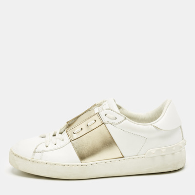 These Valentino sneakers combine smooth white leather with metallic gold accents and signature Rockstud details. The low top silhouette is stylish yet comfortable, making them ideal for everyday wear. A chic mix of elegance and edginess.