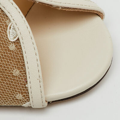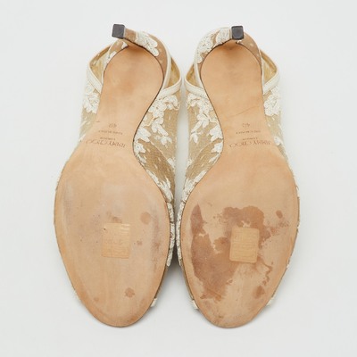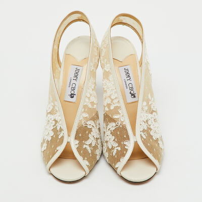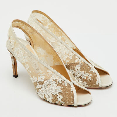 These Jimmy Choo Shar pumps combine delicate white lace with leather accents for an ethereal finish. The slingback design adds comfort while maintaining a romantic, feminine look. Ideal for bridal wear or sophisticated summer ensembles.