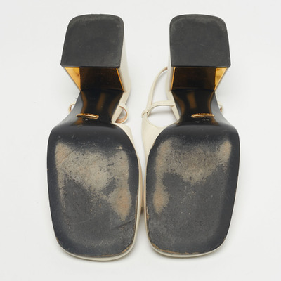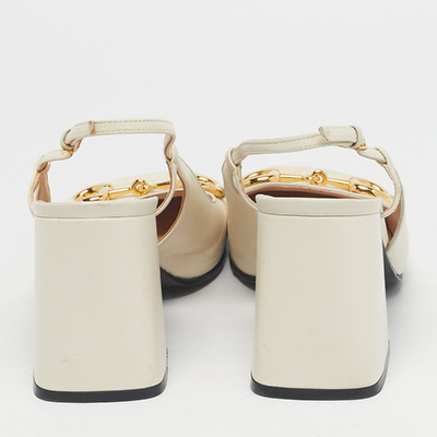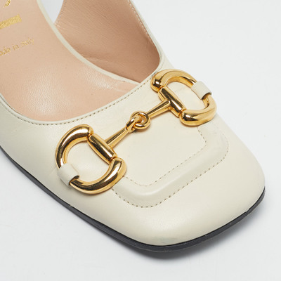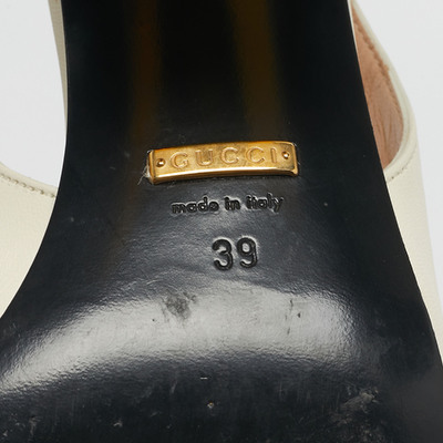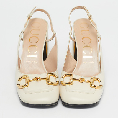 These Gucci platform pumps feature smooth cream leather and are adorned with the brand’s iconic horsebit detail. The slingback strap and elevated platform offer both comfort and retro inspired elegance. Perfect for pairing with dresses or tailored trousers for a polished look.