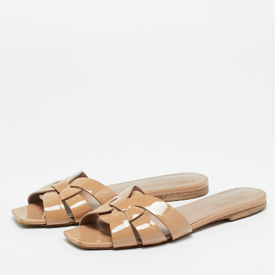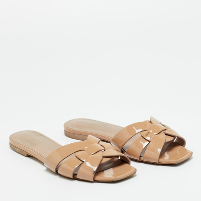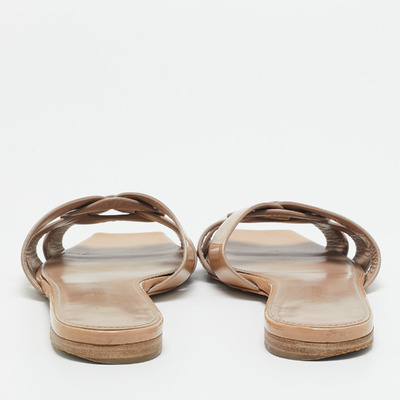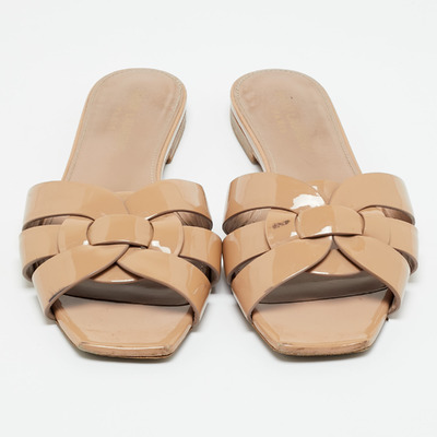 These Saint Laurent Tribute flat sandals are crafted from glossy beige patent leather for a sleek and sophisticated look. Designed with the brand’s iconic interwoven straps, they offer both comfort and elegance. Perfect for pairing with summer dresses or casual denim.