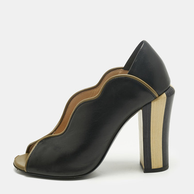 Fendi softens the sharpness of black leather with scalloped edging on these peep toe pumps. Feminine details and sleek design create a balanced, versatile pair.