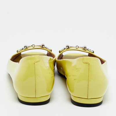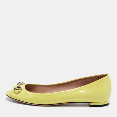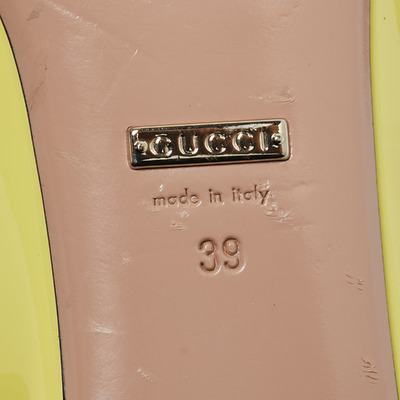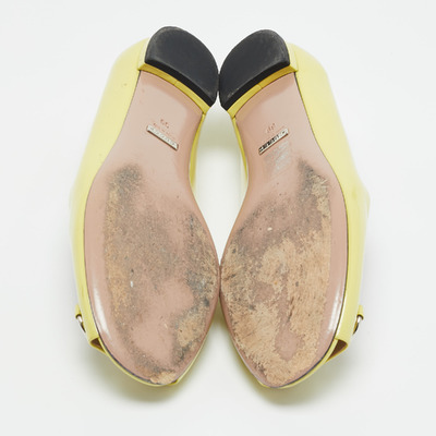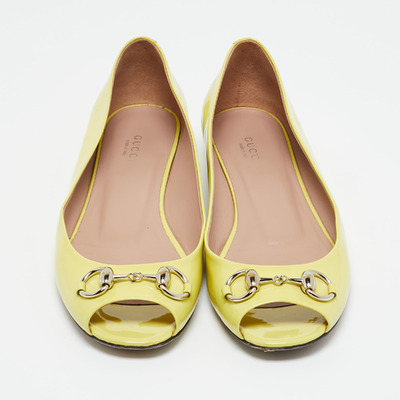 Gucci takes its horsebit heritage into playful territory with these peep toe ballet flats in neon yellow patent leather. Vibrant and glossy, they offer a daring spin on a classic style.