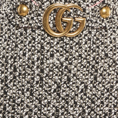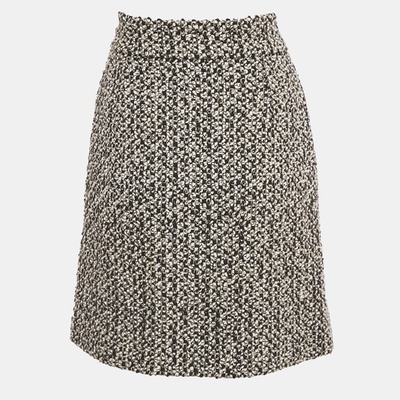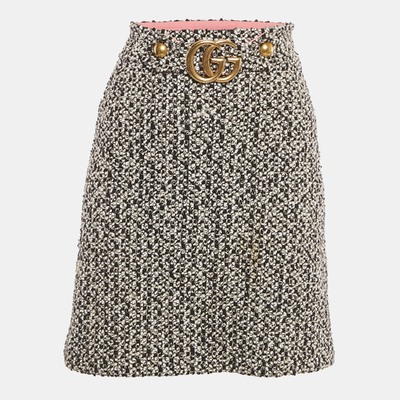 This Gucci mini skirt blends classic tweed craftsmanship with a modern edge, featuring black and white threading throughout. The standout GG metal detail adds a signature luxury touch. Perfect for pairing with blouses or knitwear for a chic day to night look.