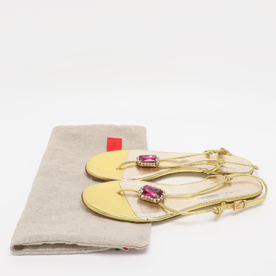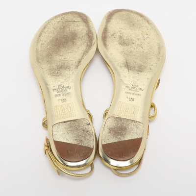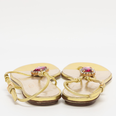 These Valentino sandals shimmer in metallic gold leather and are adorned with sparkling embellishments. Their flat design ensures comfort without sacrificing glamour. Ideal for holiday looks or evening strolls.