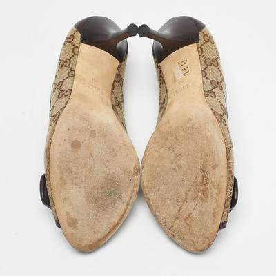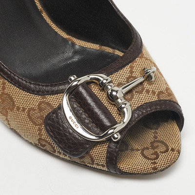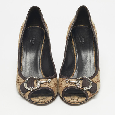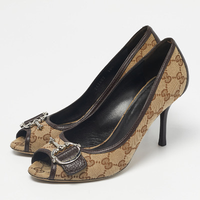 The Guccissima motif brings house heritage to these peep toe pumps, styled in beige and brown canvas. Their classic heel and open toe combine tradition with a touch of modern ease.