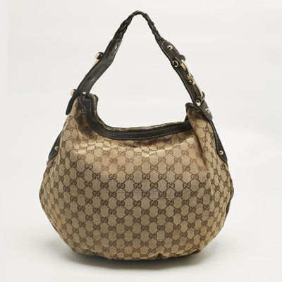 The Gucci Pelham Hobo combines iconic GG canvas with rich leather accents for a timeless finish. Its relaxed silhouette and braided handles offer effortless elegance. A must have for those who love classic luxury.