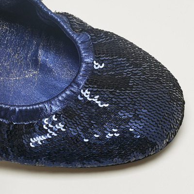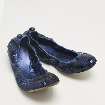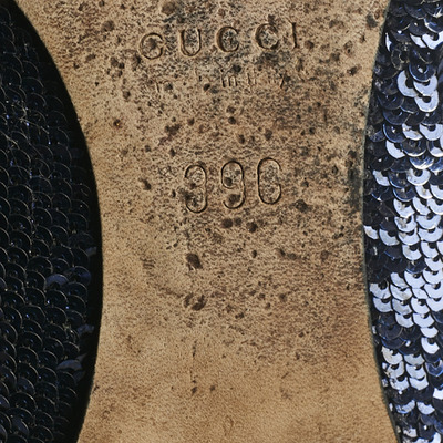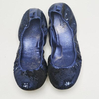 Gucci adds drama to the ballet flat, covering metallic blue leather with sequins and finishing it with a ruched, scrunch silhouette. A playful reimagination of a classic, they shimmer with every step.