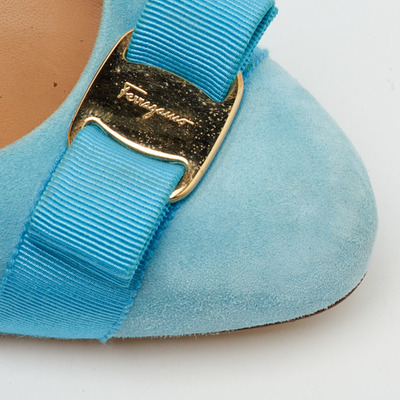 Ferragamo’s Vara pumps are refreshed with light blue suede and a platform base. A grosgrain bow with metal logo plate crowns the toe, giving a playful lift to a house classic.