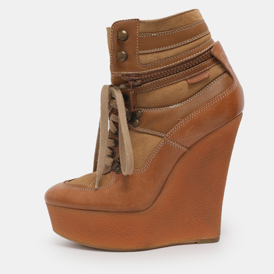 Burberry grounds these ankle boots in brown leather and suede, accented with rubber soles for traction. The mix of textures balances rugged utility with refinement.