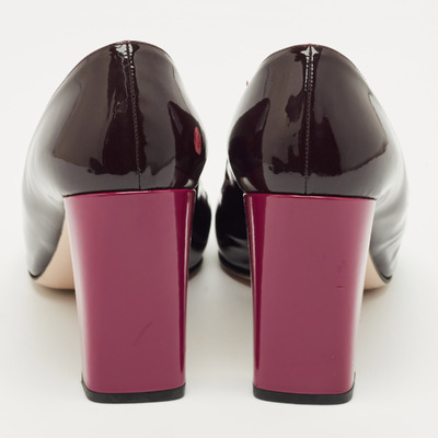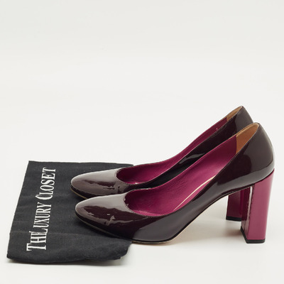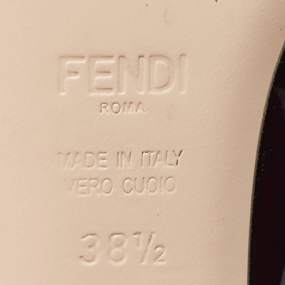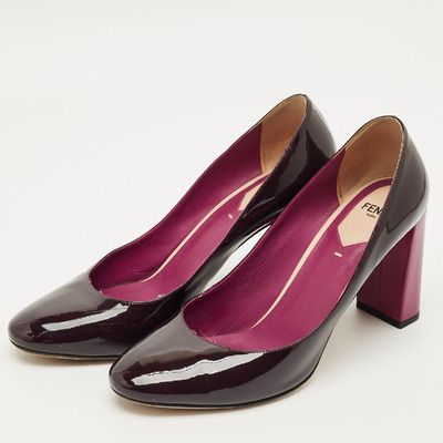 High shine burgundy patent leather defines these pre owned Fendi pumps. Set on a block heel, the silhouette blends vintage charm with modern ease, perfect for both day and evening settings.