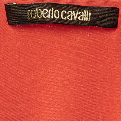 This Roberto Cavalli dress is worked in pink knit, fitted through the body with long sleeves. The little cut out and gold tone spiral accent at the front makes the design stand out.