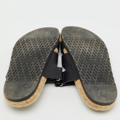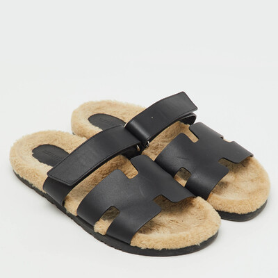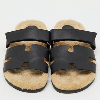 Hermes Black Leather Chypre Shearling Fur Flat Sandals Size 43 1224129 (чёрный, lpn31029024)