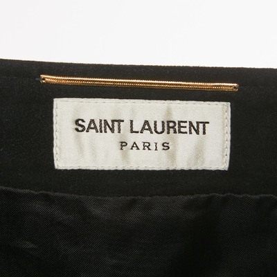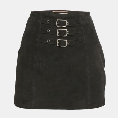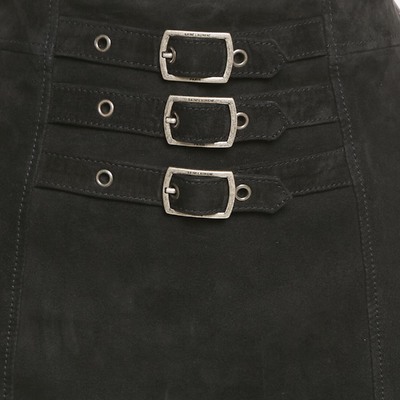 This Saint Laurent mini skirt in black suede exudes rock chic elegance with its bold buckle detailing. The fitted silhouette adds edge and sophistication. Style it with boots or heels for statement evenings.