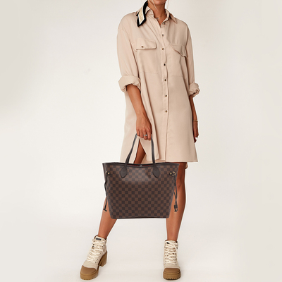 Introduced in 2007, the Neverfull by Louis Vuitton is applauded for its innovative design and faultless craftsmanship. This MM bag comes crafted from the signature Damier Ebene canvas and its striking features contribute to its timeless elegance. With a structured shape, it is held at the top by dual handles and is adorned with gold tone accents. The canvas lined interior of the bag has plenty of space to keep your daily valuables organized.