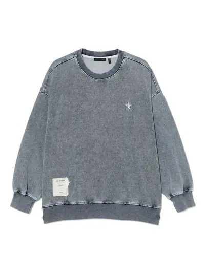 indigo blue logo patch to the front crew neck ribbed cuffs and hem long sleeves