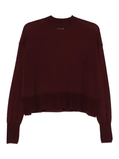red wool semi-sheer construction round neck long sleeves ribbed cuffs and hem