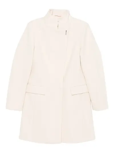 beige funnel neck concealed front fastening side flap pockets long sleeves straight hem
