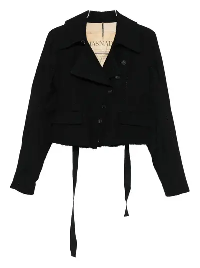 black front button fastening notched lapels strap detail long sleeves raw-cut hem