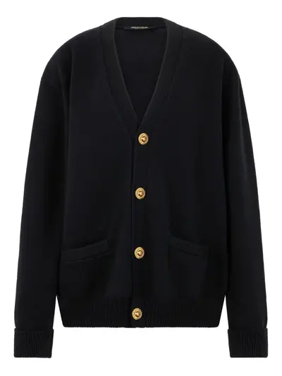 black wool v-neck gold-tone buttons two front patch pockets ribbed cuffs ribbed hem