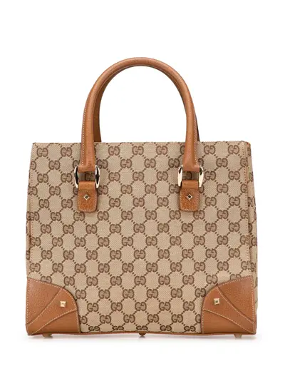 canvas body with studded leather trim rolled leather handles open top interior zip and slip pockets brown Serial Number: 120895 467891 This item has no inclusions. Condition: GOOD. This previously owned and used item is in good condition with minimal signs of use. This may include fading of material or plating and scratches. Please refer to the photos on this product page for a detailed view of the item, including any damages declared.