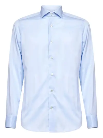 light blue front button placket spread collar long sleeves buttoned cuffs back yoke curved hem