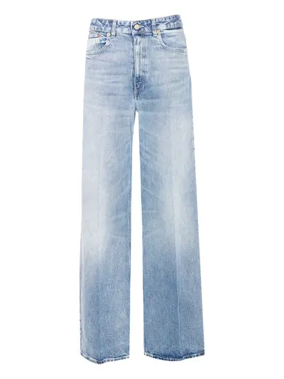 blue classic five pockets patch logo zip and button closure belt loops