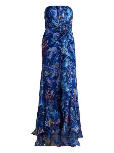 mystic blue ocean print strapless gathered detail pleated detailing ruffled trim long length