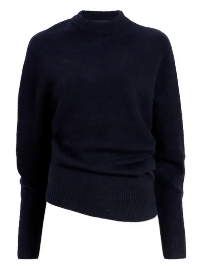 navy blue round neck long sleeves asymmetric hem gathered detail