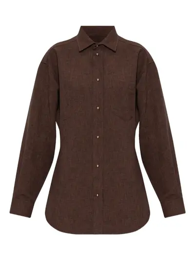 brown button fastening chest pocket long sleeves buttoned cuffs curved hem