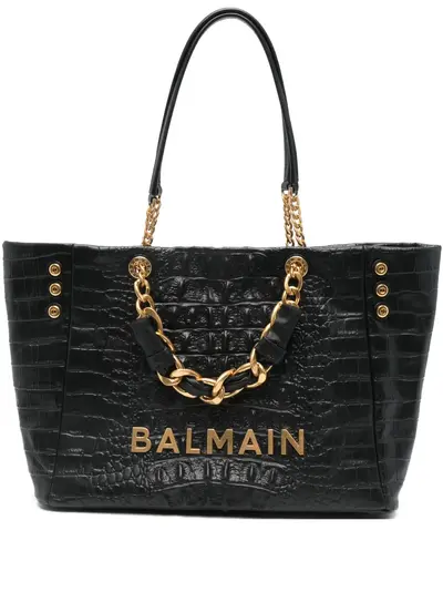 black crocodile embossed effect chain detailing two top handles gold-tone hardware snap fastening