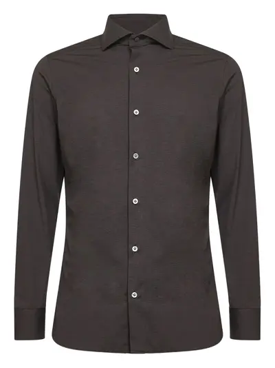 brown front button placket spread collar long sleeves buttoned cuffs back yoke curved hem
