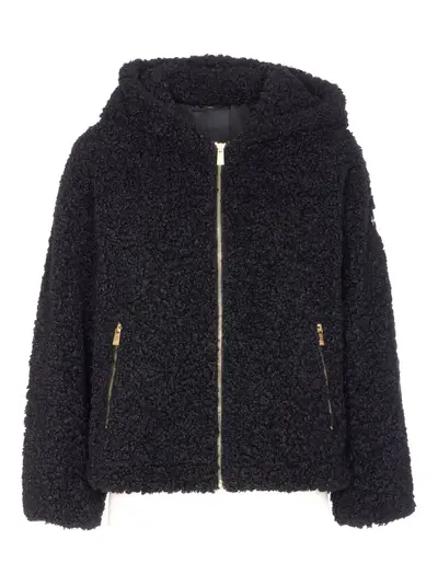 black hood zip closure lateral patch logo zip pockets long sleeves