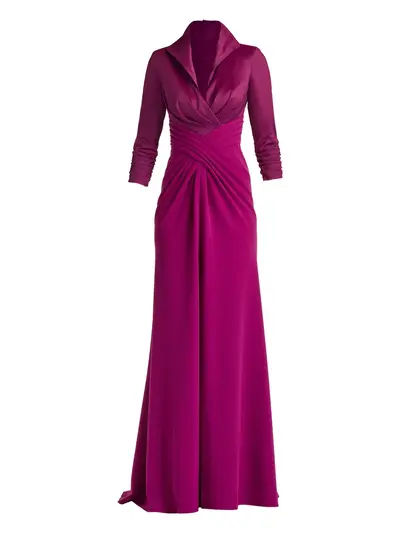 magenta purple pleated detailing three-quarter-length sleeves V-neck slit detail twist detail rear zip gastening