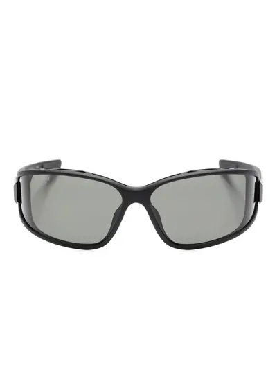 black shield frame tinted grey lenses logo detail straight tips These glasses come with a protective case.