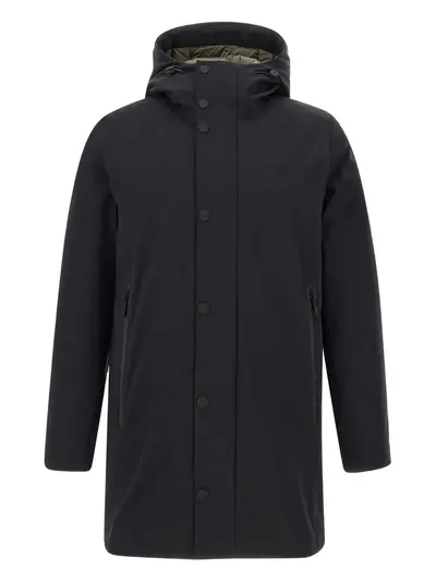 black fixed hood zip closure snap buttons taped side pockets interior pocket