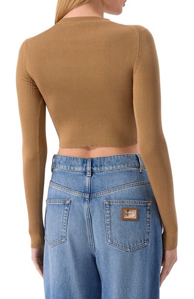 Укороченный пуловер кроя Slim fit выполнили из тонкой пряжи на основе вторичного шелка. Модель в рубчик украсили фирменным логотипом, созданным в технике интарсии.