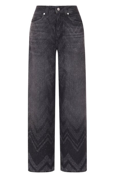 Широкие джинсы Slouchy с двумя парами карманов выполнили из неэластичного денима. Модель с потертостями, формирующими зигзаг, декорировали россыпью граненых стразов.
