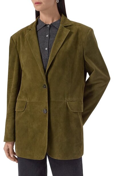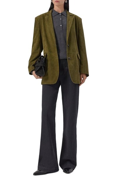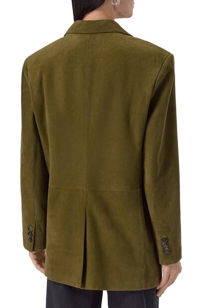 Однобортный жакет прямого кроя выполнили из тонкой замши. Модель с одной шлицей и подкладом из вискозного атласа дополнили боковыми карманами с клапанами.